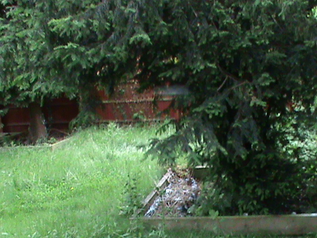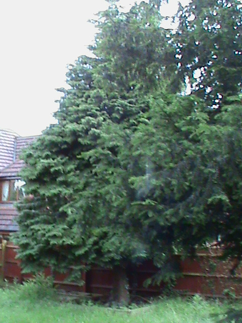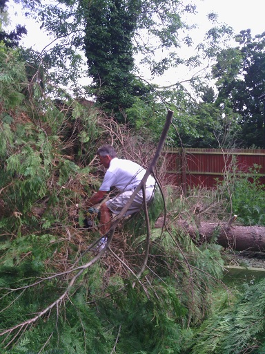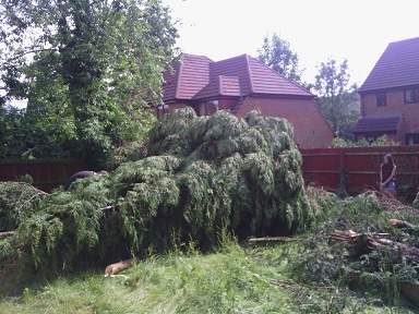 From the photos above we estimated that the largest tree was about 8-9 metres high (fence is 1.75 metres) and was 11 metres from the house. A friend offered to cut the two trees down and turned up on Monday 25th June with his chainsaw. I climbed the largest tree and attached a rope. As he was doing the backcut, three of us pulled on the rope and the tree landed about 50cm from the house.